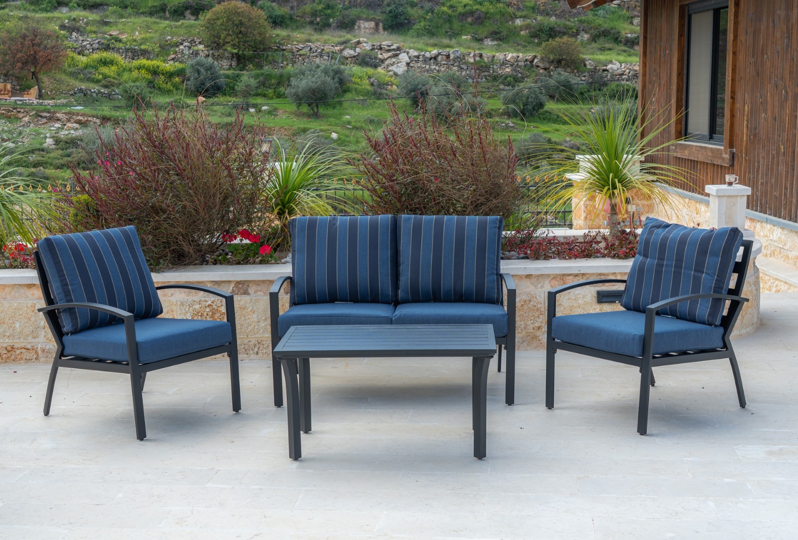 סט ישיבה חוץ מרהיב בעיצוב מודרני ונקי, עם שלד מתכת אלומיניום בגוון אפור כהה וריפוד מרופד בצבע כחול עם פסים שחורים.