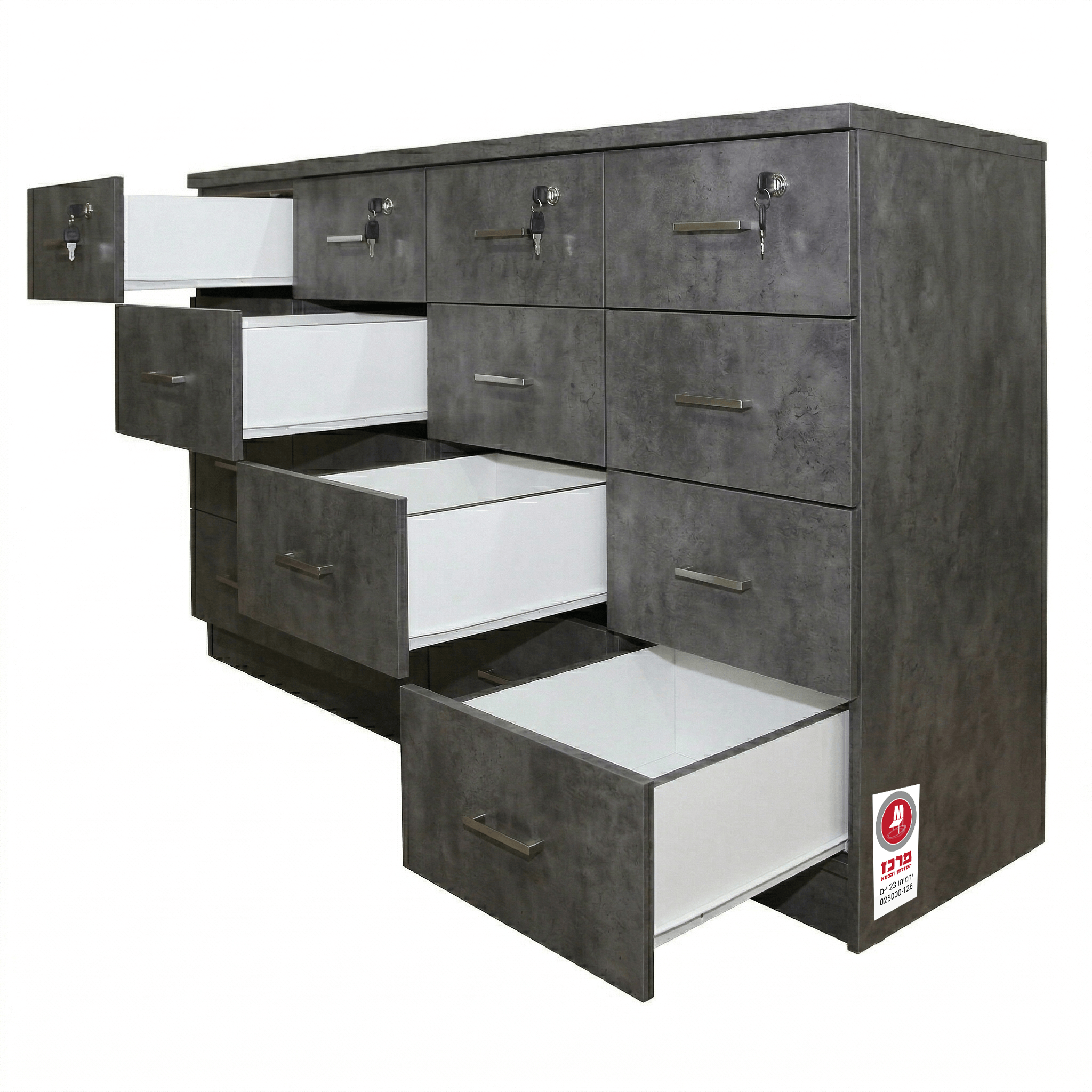 ארגז אחסון פונקציונלי ורחב במיוחד הכולל 16 מגירות מרווחות, המספק פתרון אחסון מקסימלי לארגון חכם של סביבת העבודה או המשרד. ארבע המגירות בשורה העליונה מצוידות במנעולים לשמירה על ציוד אישי ומסמכים חשובים, וכל המגירות מגיעות עם ידיות מתכת נוחות לאחיזה. הרהיט בנוי ברמת גימור גבוהה וניתן להזמנה במגוון רחב של צבעי מלמין, כך שיתאים באופן מושלם לעיצוב החלל שלכם.