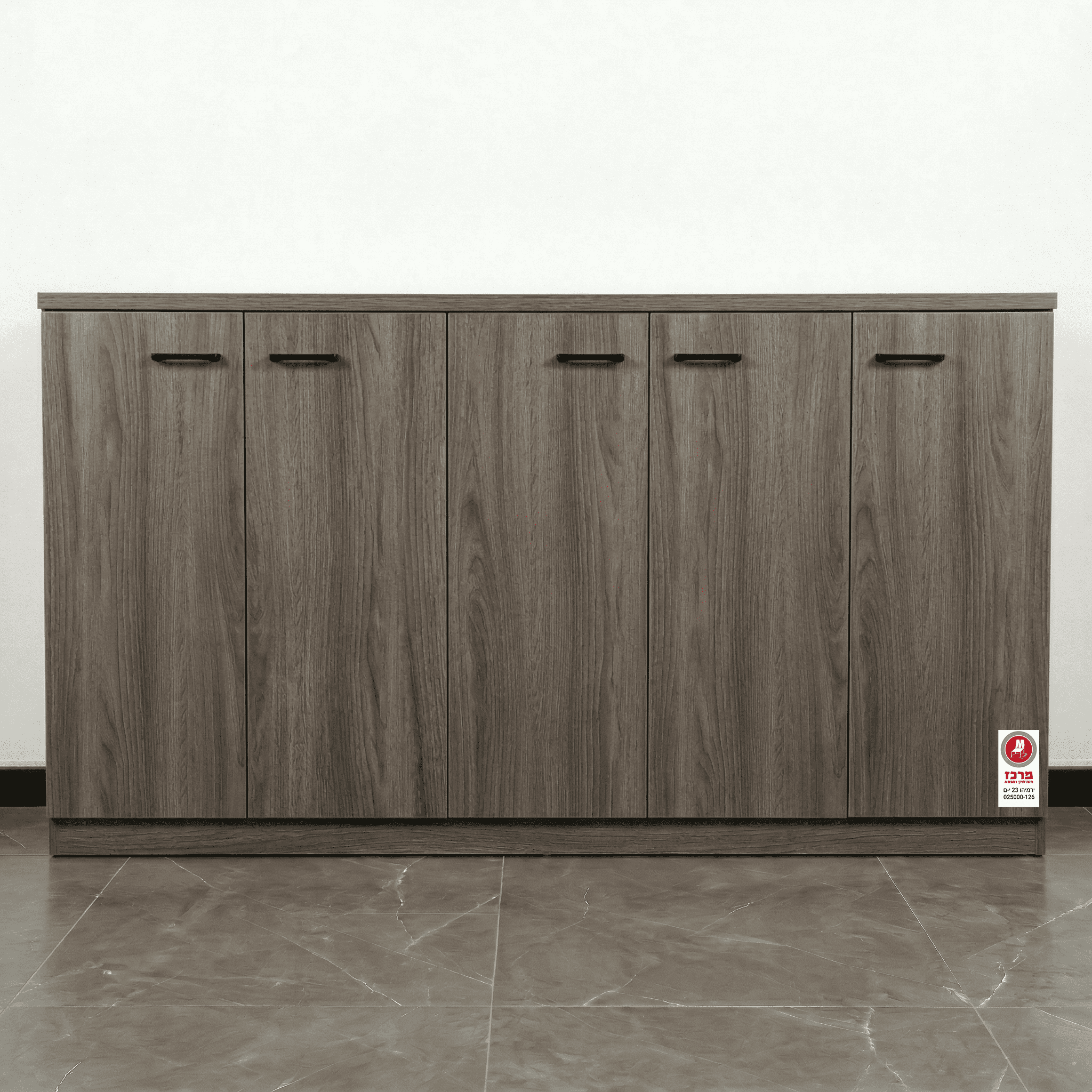 ארון משרד נמוך ומודרני המספק שטח אחסון רחב ופתרון אסתטי למשרד ולבית. הדגם כולל חמש דלתות בעיצוב נקי עם ידיות מעוצבות במראה יוקרתי. הארון  מגיע במגוון עשיר של גווני מלמין לבחירה להתאמה אישית מלאה לכל חלל עבודה.