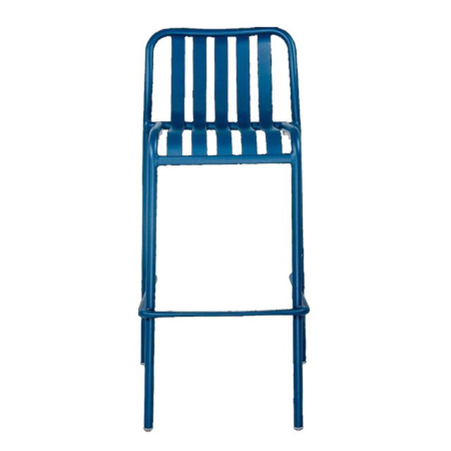 כיסא בר מעוצב מאלומיניום בגוון כחול עמוק הכולל מושב ומשענת פסים למראה תעשייתי ואופנתי הכיסא מתאפיין במבנה קל משקל ועמיד במיוחד המתאים לשימוש פנים וחוץ וכולל משענת רגליים לנוחות ישיבה ממושכת.