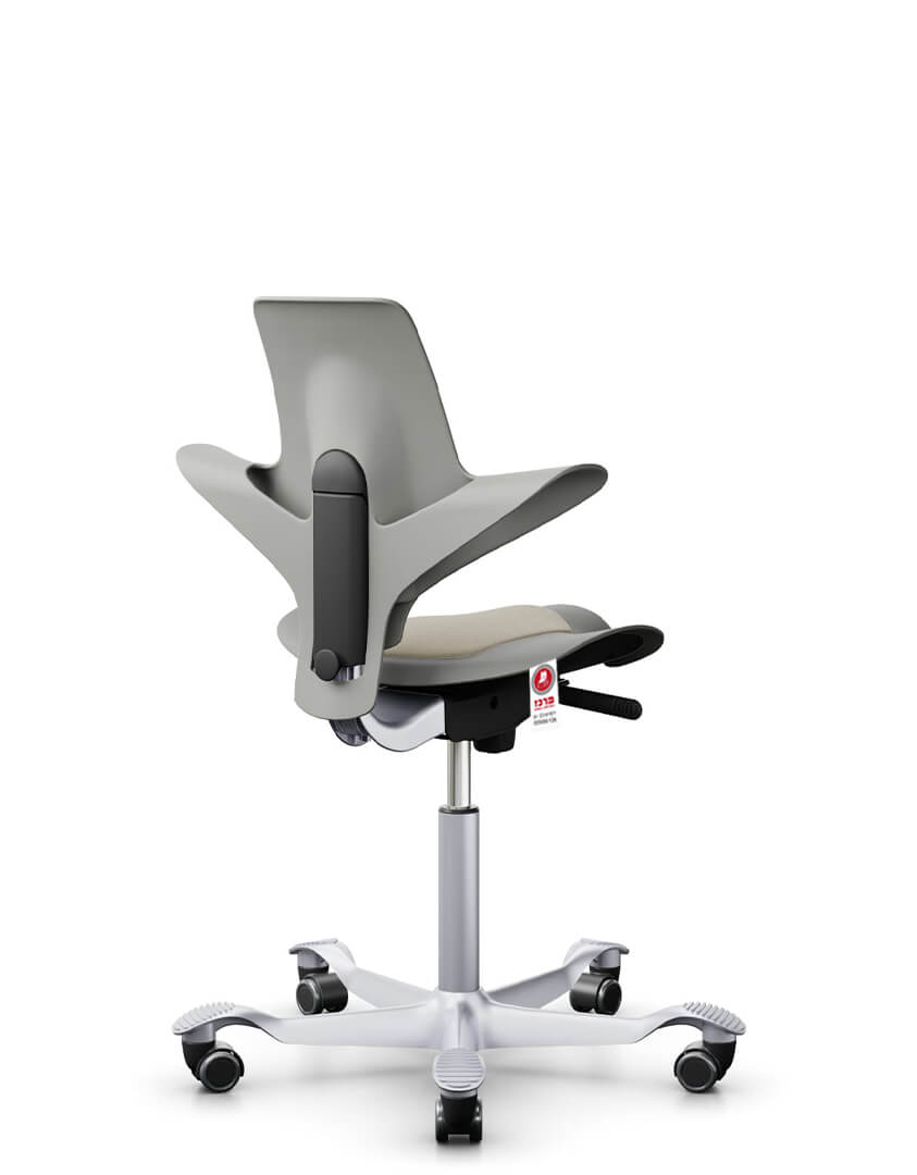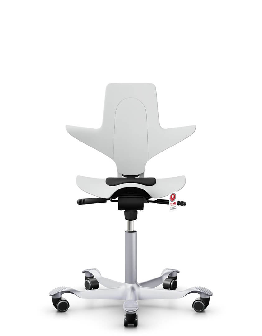 המושב בנוי בצורת אוכף לתמיכה אופטימלית בגב התחתון ולחופש תנועה מרבי של הידיים – מתאים במיוחד לעבודה ממושכת מול מחשב או לעמדות טיפול ויצירה.
