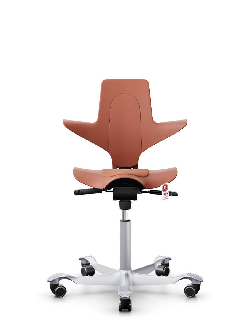 כיסא אוכף ארגונומי בצבע אפור בהיר/כהה או חמרה, המשלב עיצוב ייחודי עם מבנה מתקדם וקל-משקל. בסיס רחב ויציב עם גלגלים לשימוש נייד ויומיומי במשרד או בבית.