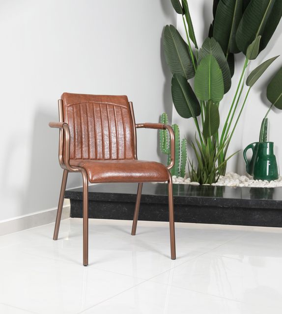 כיסא מעוצב בגוון חום בהיר בעל ריפוד דמוי עור יוקרתי ותפרים אנכיים למראה מודרני שלדת מתכת חזקה בגימור ברונזה המעניקה יציבות ונוחות מרבית לפינת האוכל או למשרד.