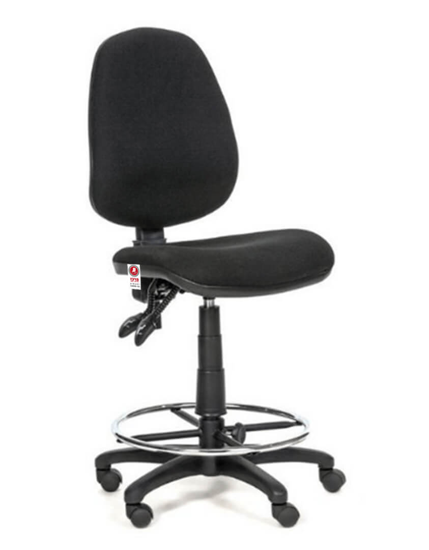 כסא עם בוכנה גבוה ועם חישוק לרגליים ניתן לקבל במבחר ריפודים בד/סקאי. אופציה לידיות