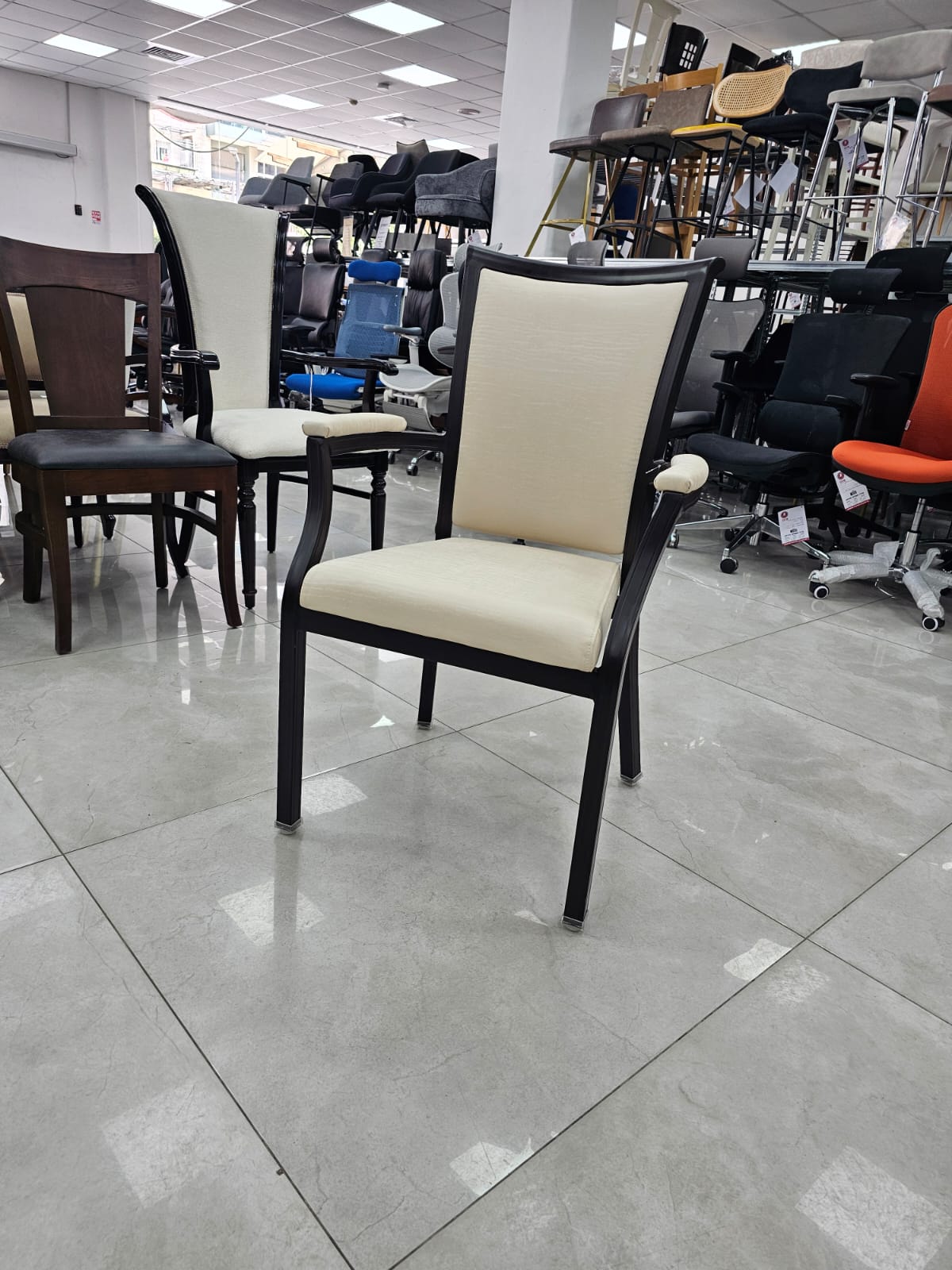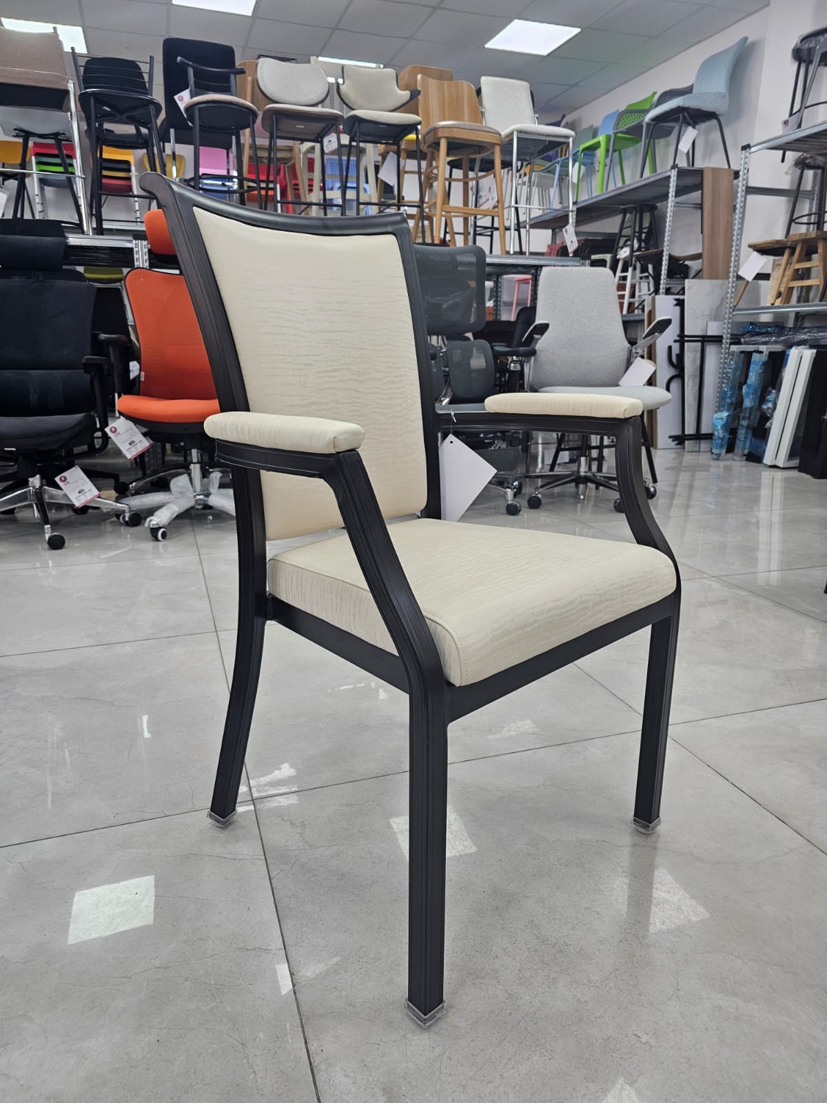 כיסא אלומיניום איכותי עם שלדת מתכת חזקה בגימור דמוי עץ, וריפוד נעים בגוון שמנת מדמוי עור.