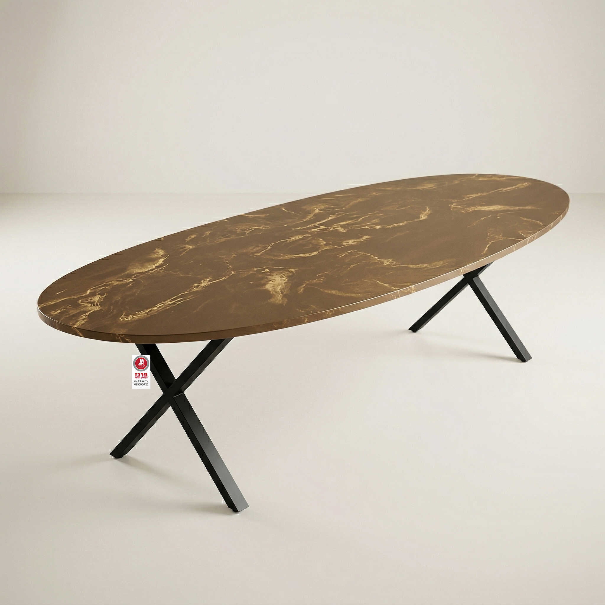 שולחן אוכל אליפטי בעיצוב מודרני ומזמין, הכולל פלטה רחבה ורגלי מתכת מוצלבות בצבע שחור, ליצירת אווירה חמה ויוקרתית בפינת האוכל הביתית. הפלטה מיוצרת מלוח סנדוויץ' איכותי המעניק לה חוזק ויציבות, ומצופה בפורמייקה עמידה על מנת להתאים באופן מושלם לטעם האישי ולעיצוב הפנים שלכם, ניתן להזמין את הפלטה במבחר עצום של גווני פורמייקה שונים.